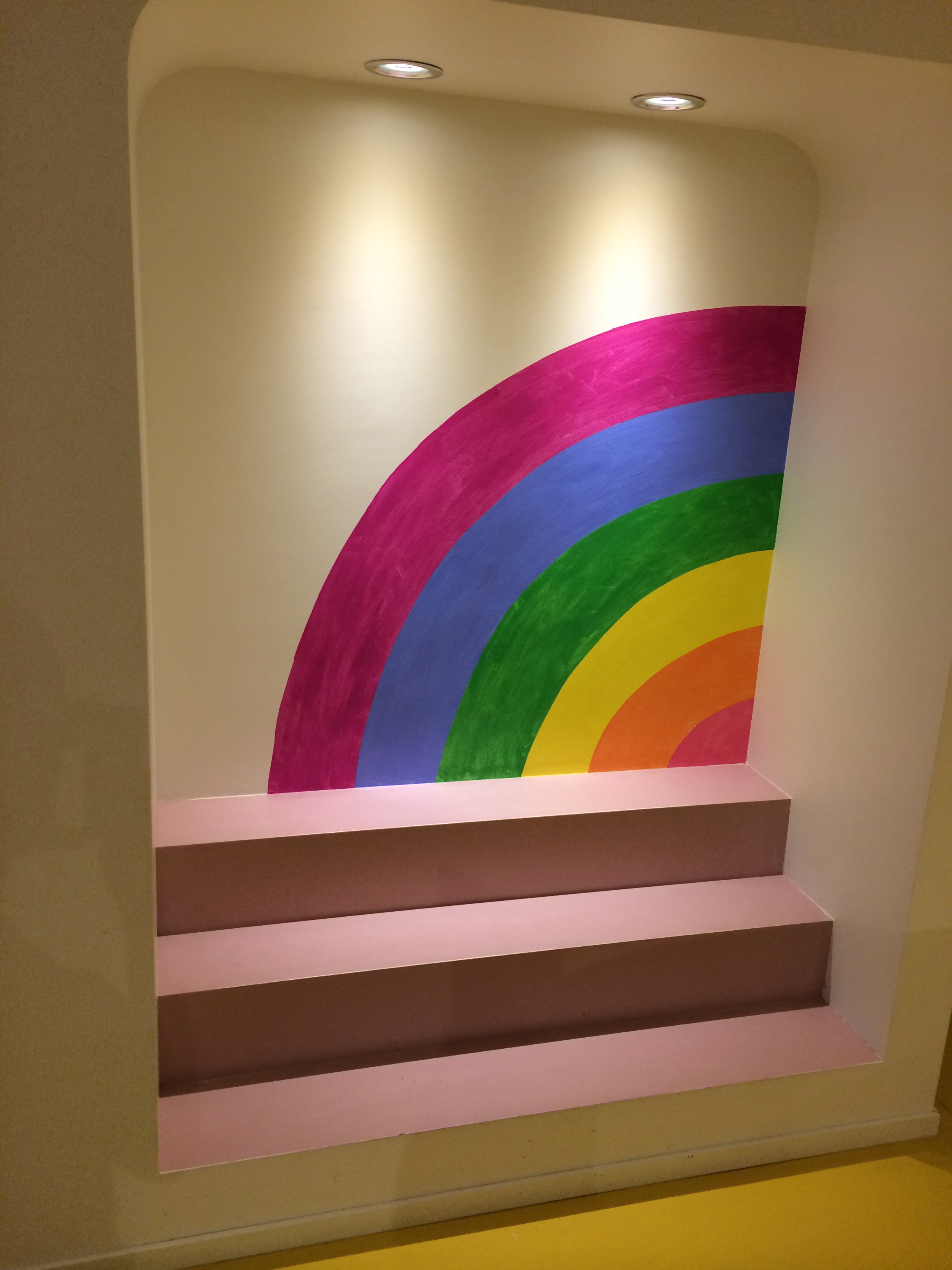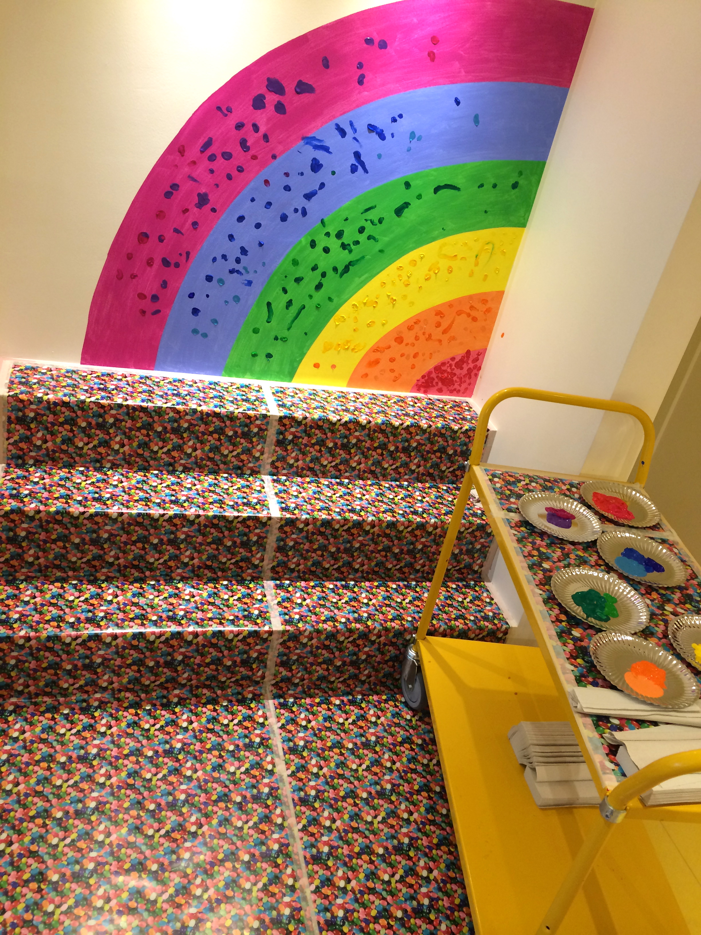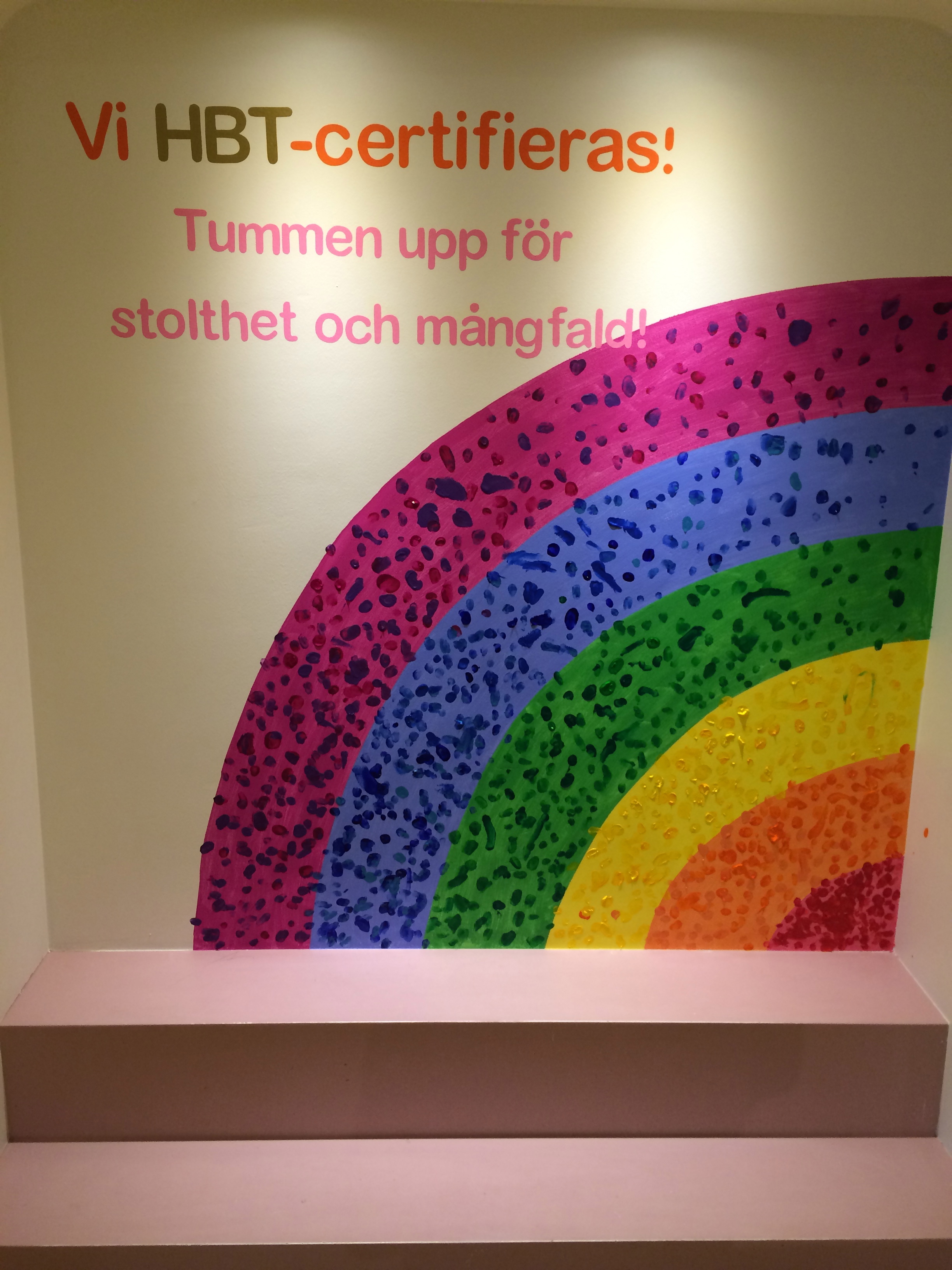 Solna stadsbibliotek håller på att HTB-certifieras. För att visa detta bjöds förskoleklasser in till ett par workshops med mig där vi målade en regnbåge med tumavtryck och lyssnade på högläsning av queera sagor. Målningen blev klar 5/9 2014 och finns på plats på barnavdelningen på biblioteket i Solna Centrum.