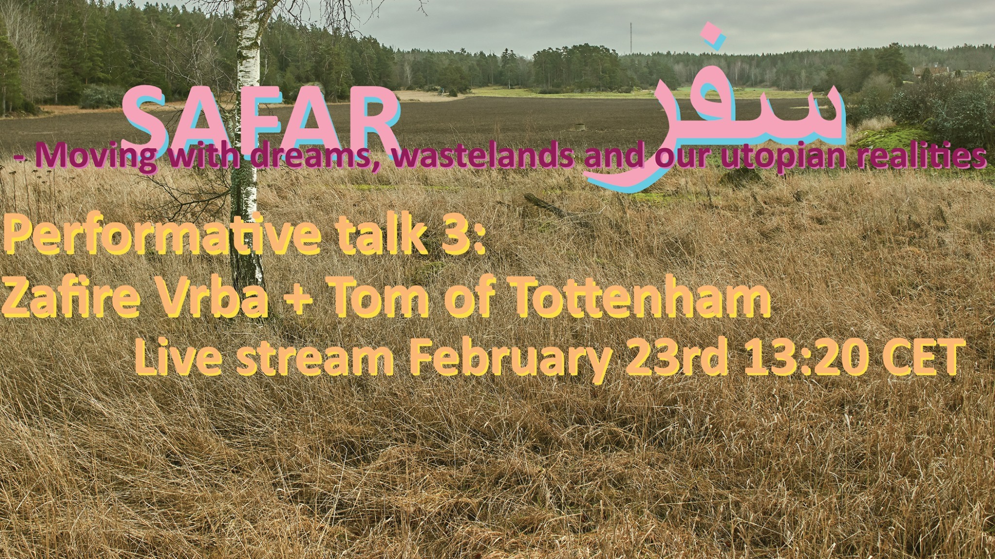 Safar* is a series of performances in public space. Performative talks between activists, thinkers, witches and artists about anarchy, strategy, possible utopian realities and the spaces our bodies inhabit. Dreams practiced. In wastelands and gardens of exiles.