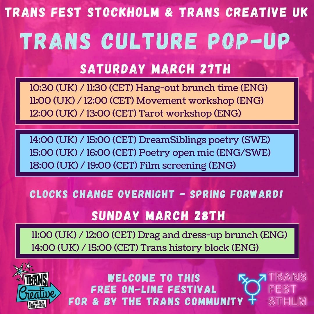 Trans Fest Stockholm-kollektivet som jag är med i arrangerar en onlinefestival för transkultur tillsammans med Trans Creative UK 27-28/3 2021.