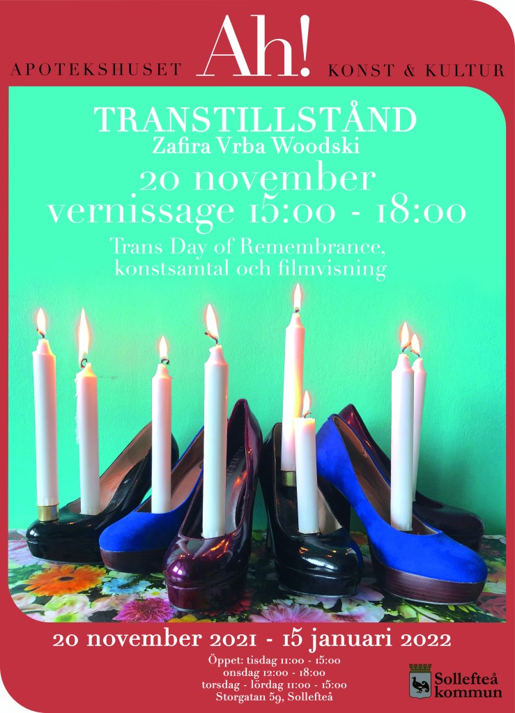 Transtillstånd är som en resa bortom tid och rum där queert mod, minnesstunder för döda vänner, könsuppdelade toaletter, syskonskap och tvångssteriliseringar samsas med euforin av att vara transperson.Utställningen pågår 20/11 2021 till 15/1 2022. Vernissage är lördagen 20/11 kl 14-18 som även är Trans Day of Remembrance. Denna dag uppmärksammas världen över för att hedra de transpersoner som dött eller dödats senaste året. Under vernissaget blir det performance, filmvisning, samtal, minnesstund och ljusceremoni.