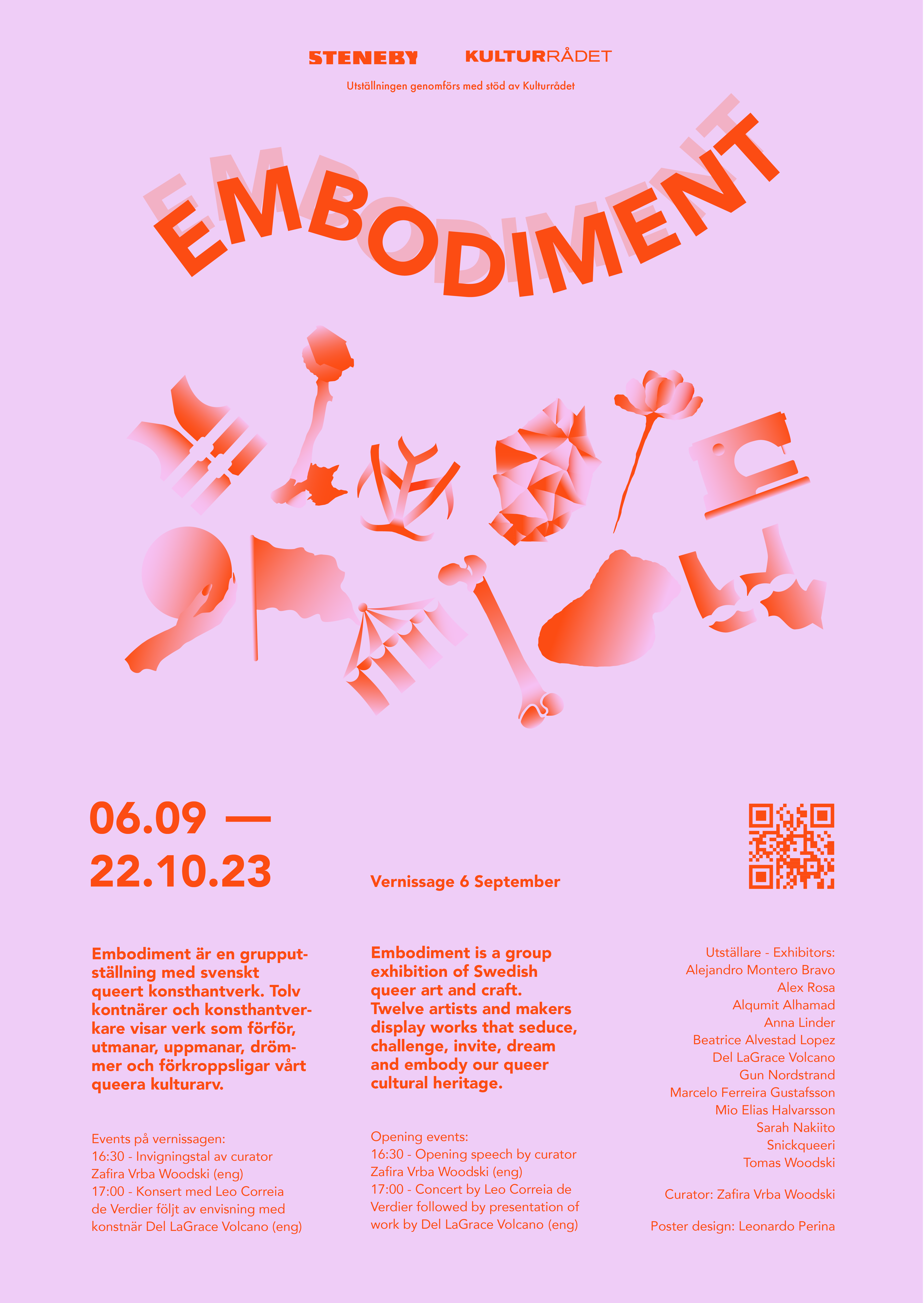 Embodiment är en grupputställning med svenskt queert konsthantverk. Tolv konstnärer och konsthantverkare visar verk som förför, utmanar, uppmanar, drömmer och förkroppsligar vårt queera kulturarv. Skulpturala fotografier möter keramiska drömmar, vävda historier och textila slagord – och mycker mer därtill.
