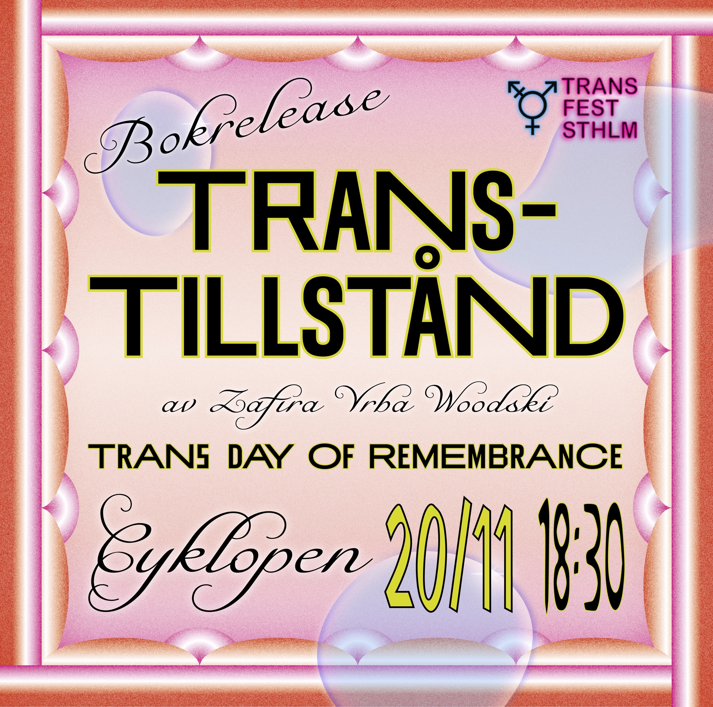 Trans Fest Stockholm hälsar alla välkomna till årets uppmärksammande av Trans Day of Remembrance. Kvällen börjar med en release av boken Transtillstånd av konstnären, dödsdoulan och transaktivisten Zafira Vrba Woodski. Zafiras bok handlar om samtidstranshistoria, sorgearbete och könseufori (formgiven av Sissela Nordling Blanco, som också gjort postern). Därefter följer performance, tal och öppen mick med Mariconas.