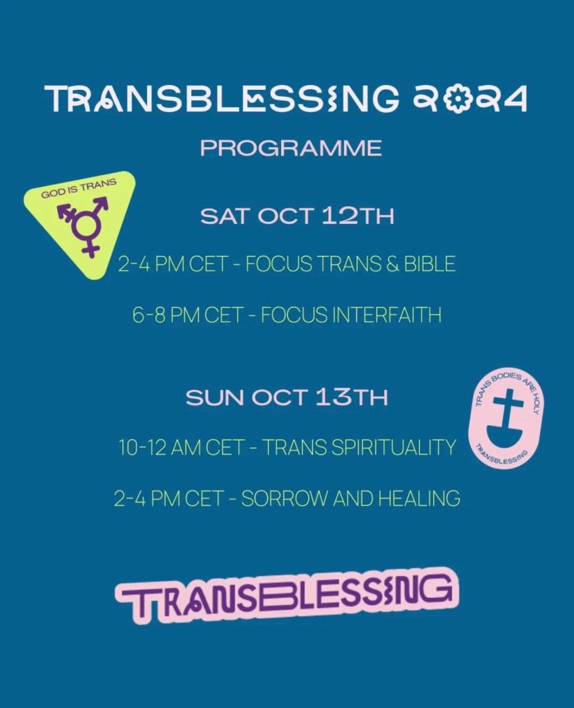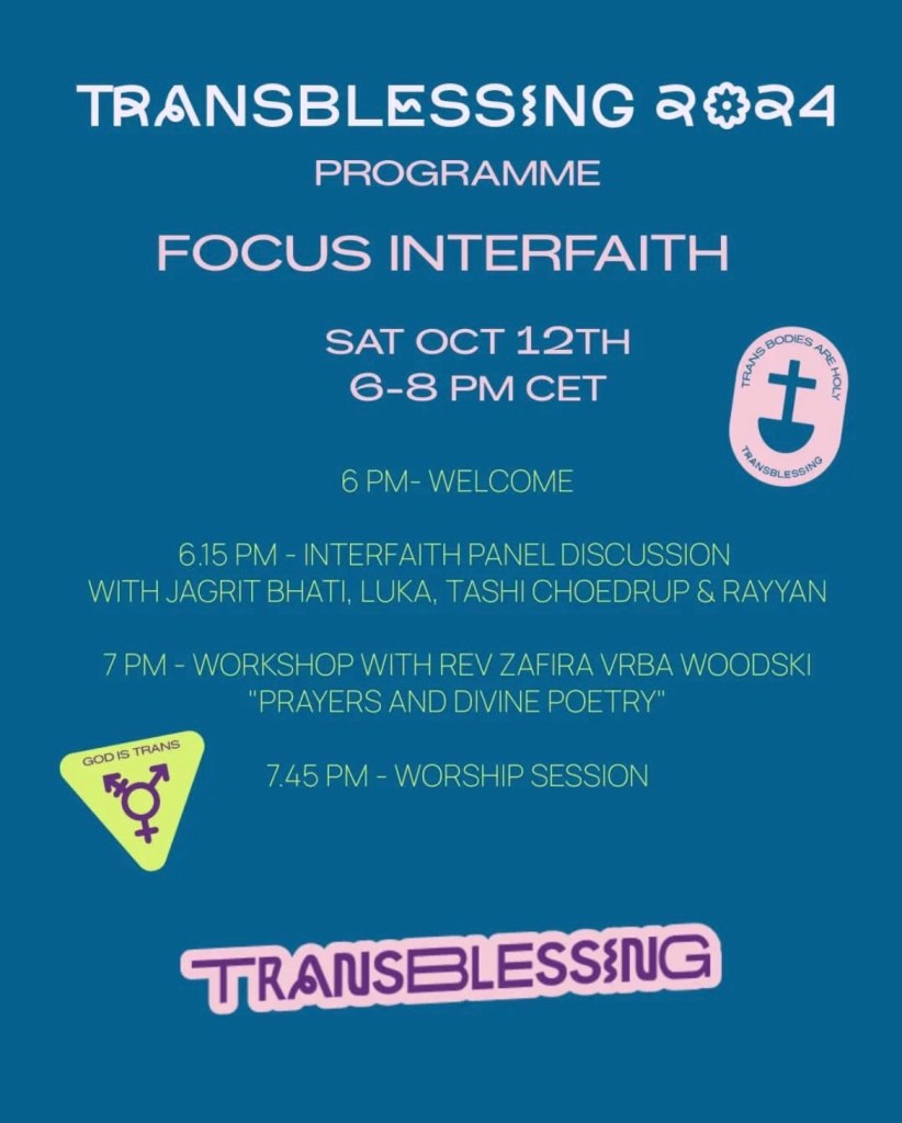 Jag är stolt och glad att medverka i årets Transblessing! Lördagen 12/10 håller jag skrivworkshopen Prayers & Divine Poetry som en del av Interfaith-blocket av konferensen. Hela programmet är online och ser helt fantastiskt ut. Du hittar programmet och information här.