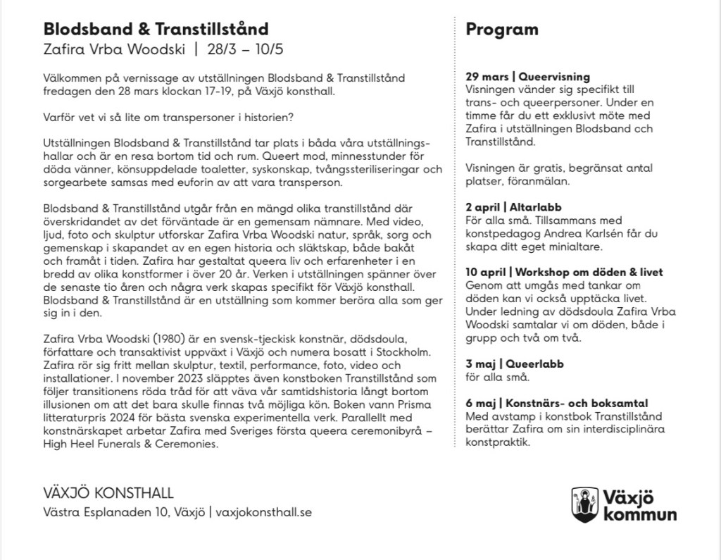 Varmt välkommen på utställningen Blodsband & Transtillstånd på Växjö konsthall! Vernissage 28:e mars 2025 kl 17-19. Utställningen hänger till 10:e maj.