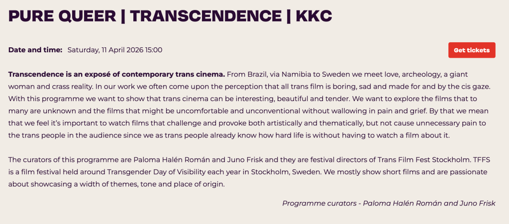 Warmly welcome to a screening of contemporary trans cinema, curated by Juno Frisk and Paloma Halén Román from Trans Film Fest Stockholm. My film I’m continuously crying tears of estrogen and tears of testosterone is screened on Saturday, April 11th in Riga.