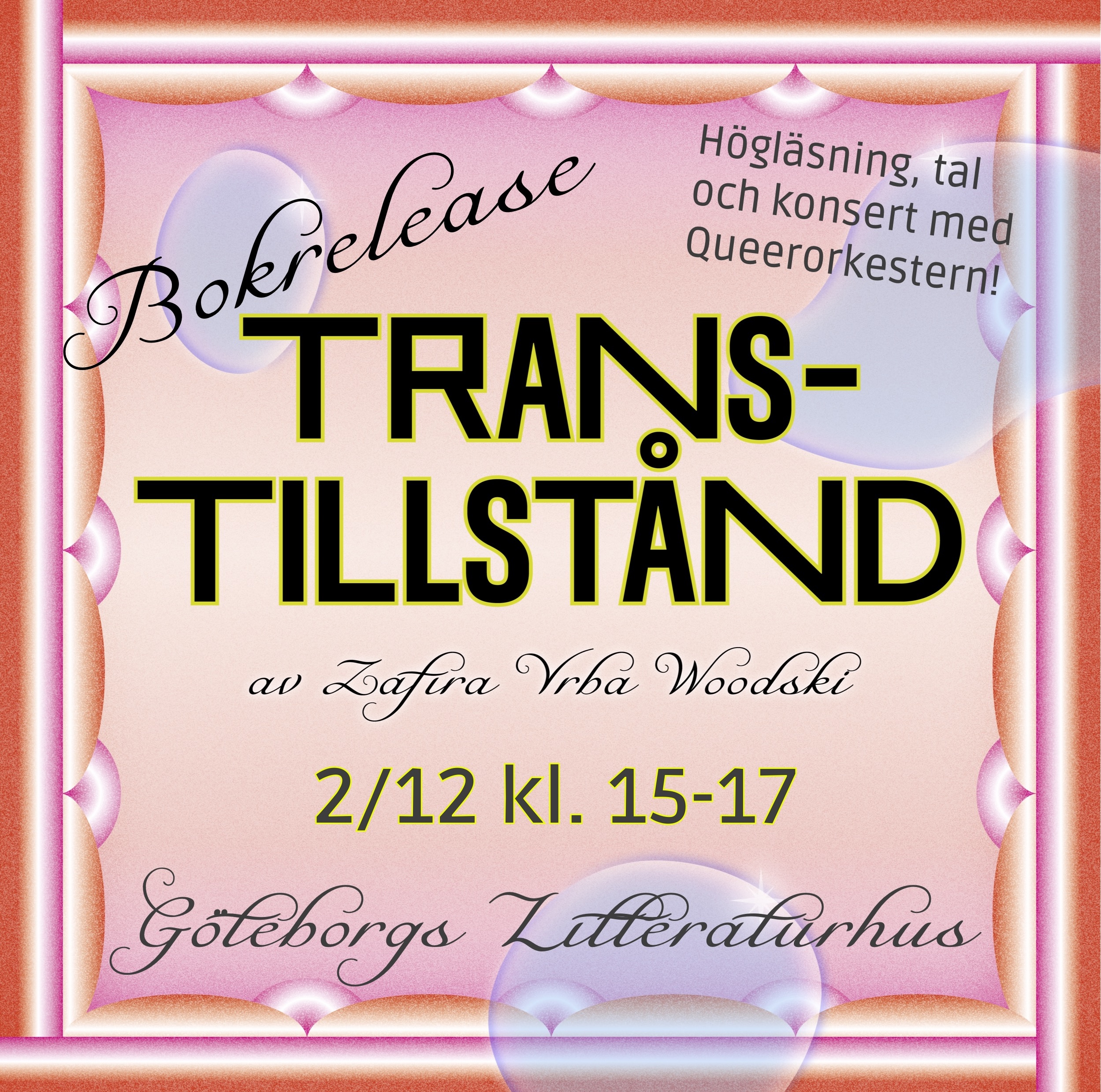 Transtillstånd släpptes 20/11 2023 i samband med Trans Day of Remembrance på Cyklopen i Stockholm i samarbete med Trans Fest Stockholm och 2/12 2023 på Litteraturhuset i Göteborg.