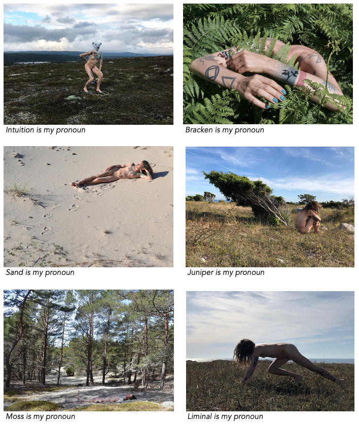 Filmerna Death is my pronoun, On Animals and Cleaning och I’m continuously crying tears of estrogen and tears of testosterone ingår i Transtillstånd och finns separat beskrivna under kategorin Film här på hemsidan. I projektet ingår också Promonenserien, exempel här nedan, och fotoserien Some of Our Gifts, ljudsinstallationen Transitioning Orchestra och flera videoinstallationer. I november 2023 gav High Heel Publishing ut boken Transtillstånd som samlar hela projektets innehåll i en rikt illustrerad konstbok.