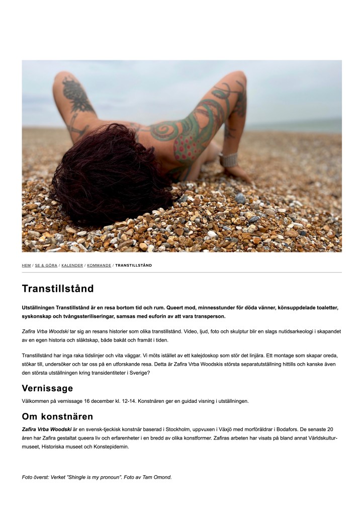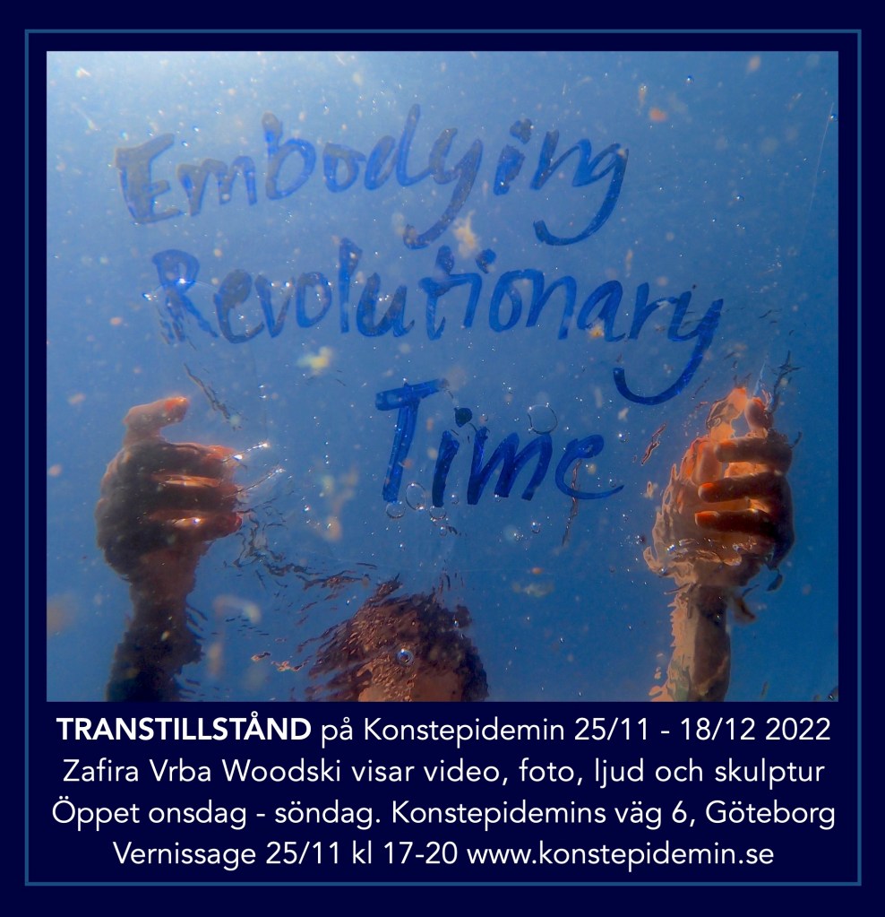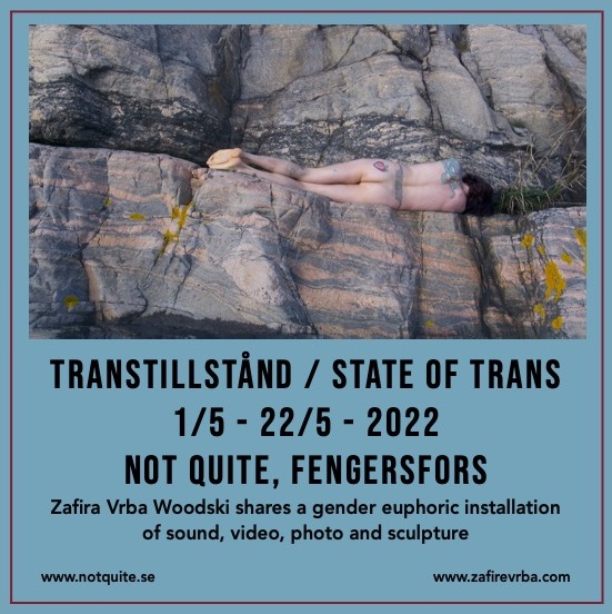 Zafira Vrba Woodski tar sig an dessa historier som olika transtillstånd. Video, ljud och foto blir en slags nutidsarkeologi i skapandet av en egen historia och släktskap bakåt och framåt i tiden. Resan i Transtillstånd är inte linjär med start och mål, dåtid och nutid. Den queera tiden är revolutionär.